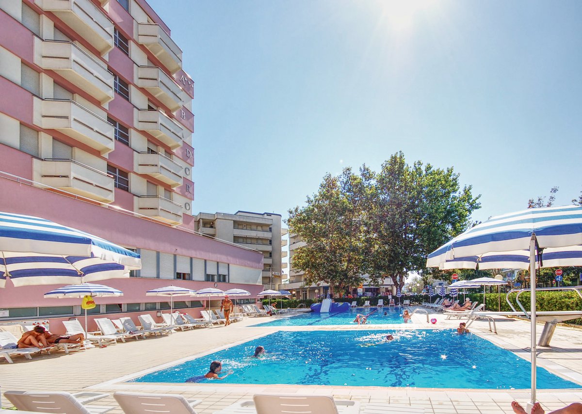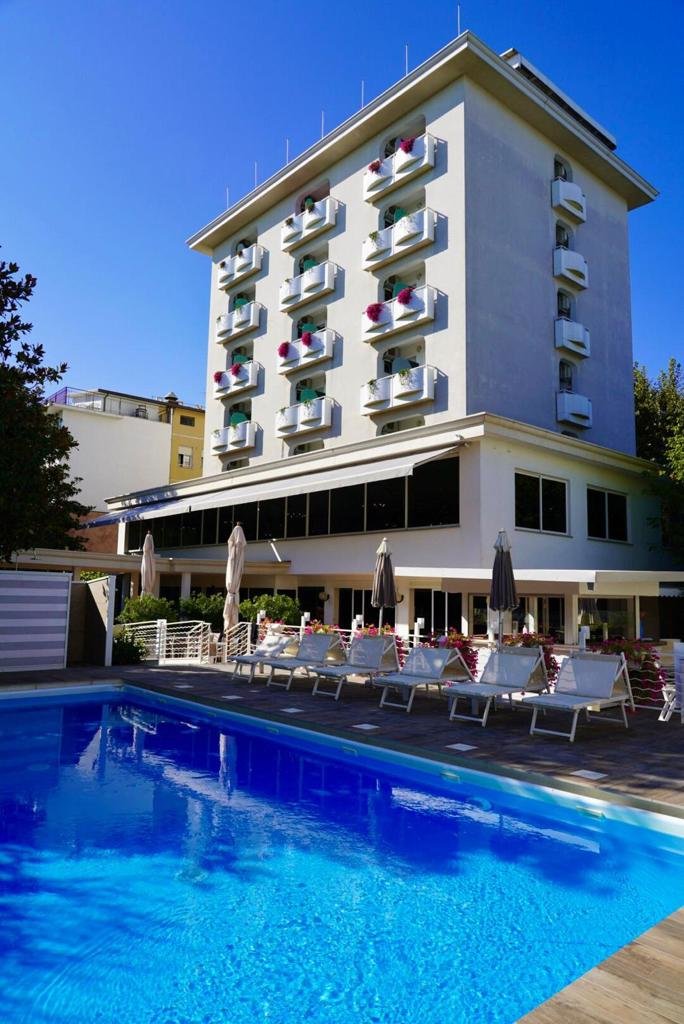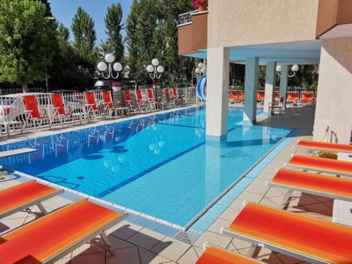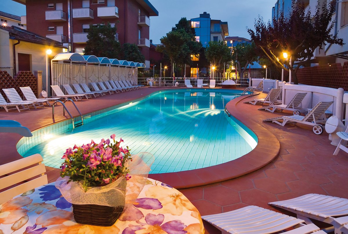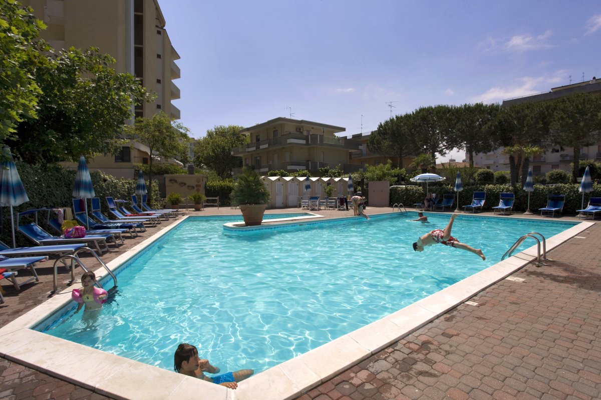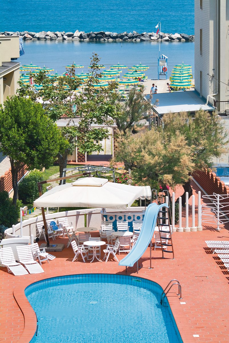 Ausstattung: Von der Besitzerfamilie geführtes Haus mit Bar, Aufenthaltsraum, Panorama-Speisesaal mit Klimaanlage, Lift, WLAN. Gartenterrasse, Swimmingpool mit Liegen und Sonnenschirmen, Kinderbecken mit Wasserrutsche.