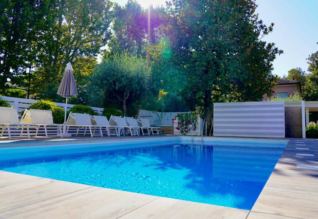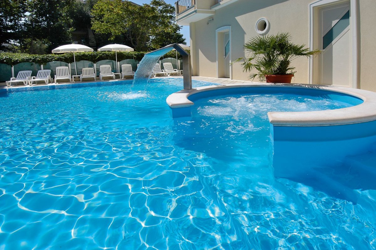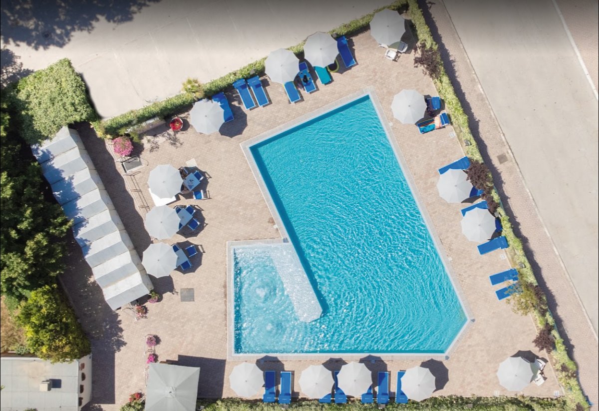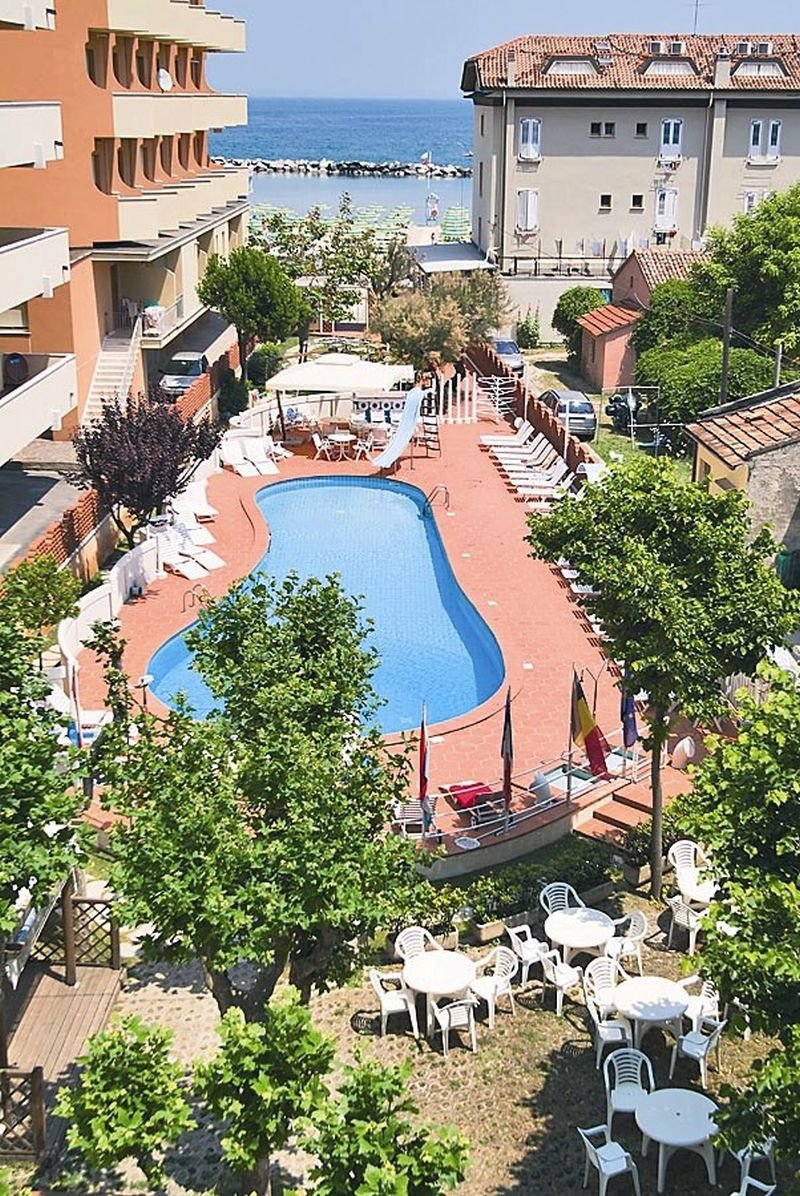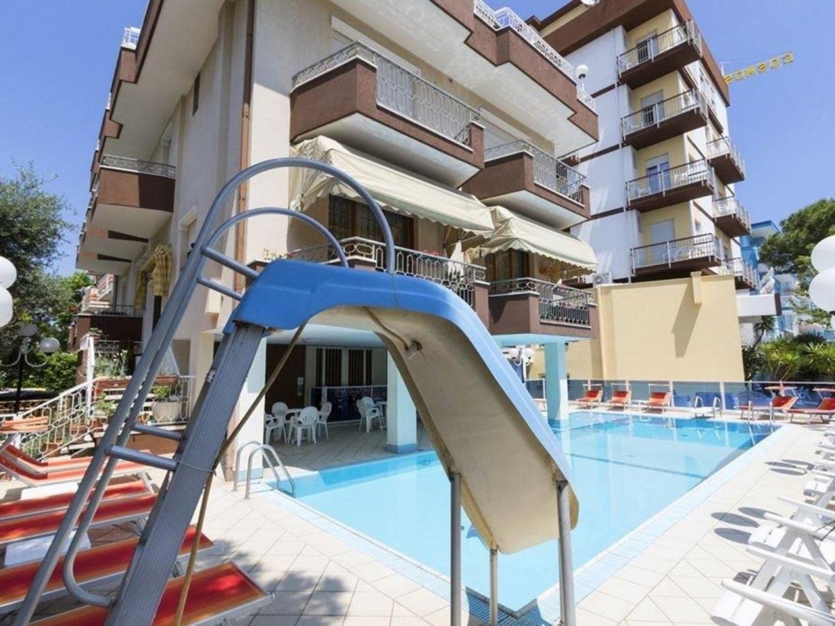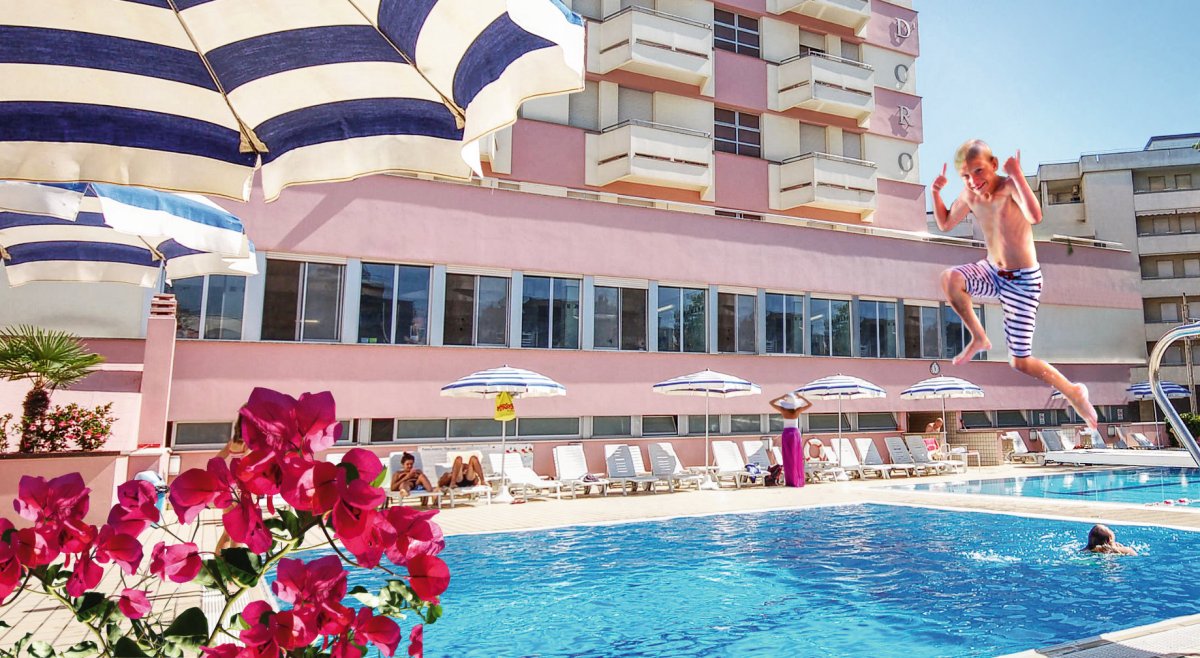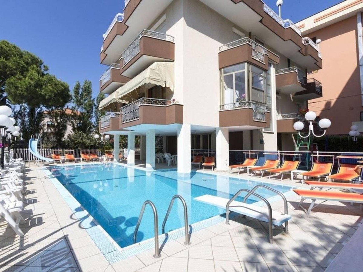 Ausstattung: Von der Besitzerfamilie geführtes Haus mit Bar, Aufenthaltsraum, Panorama-Speisesaal mit Klimaanlage, Lift, WLAN. Gartenterrasse, Swimmingpool mit Liegen und Sonnenschirmen, Kinderbecken mit Wasserrutsche.