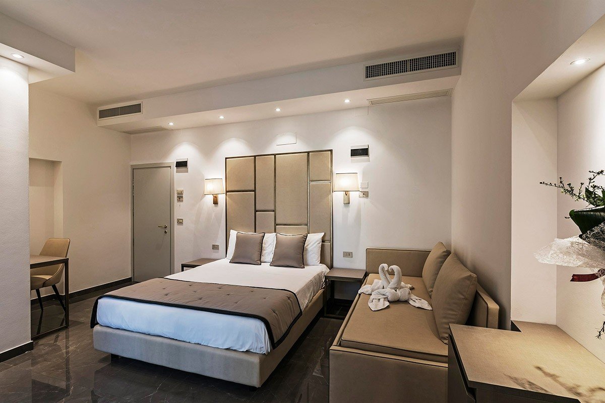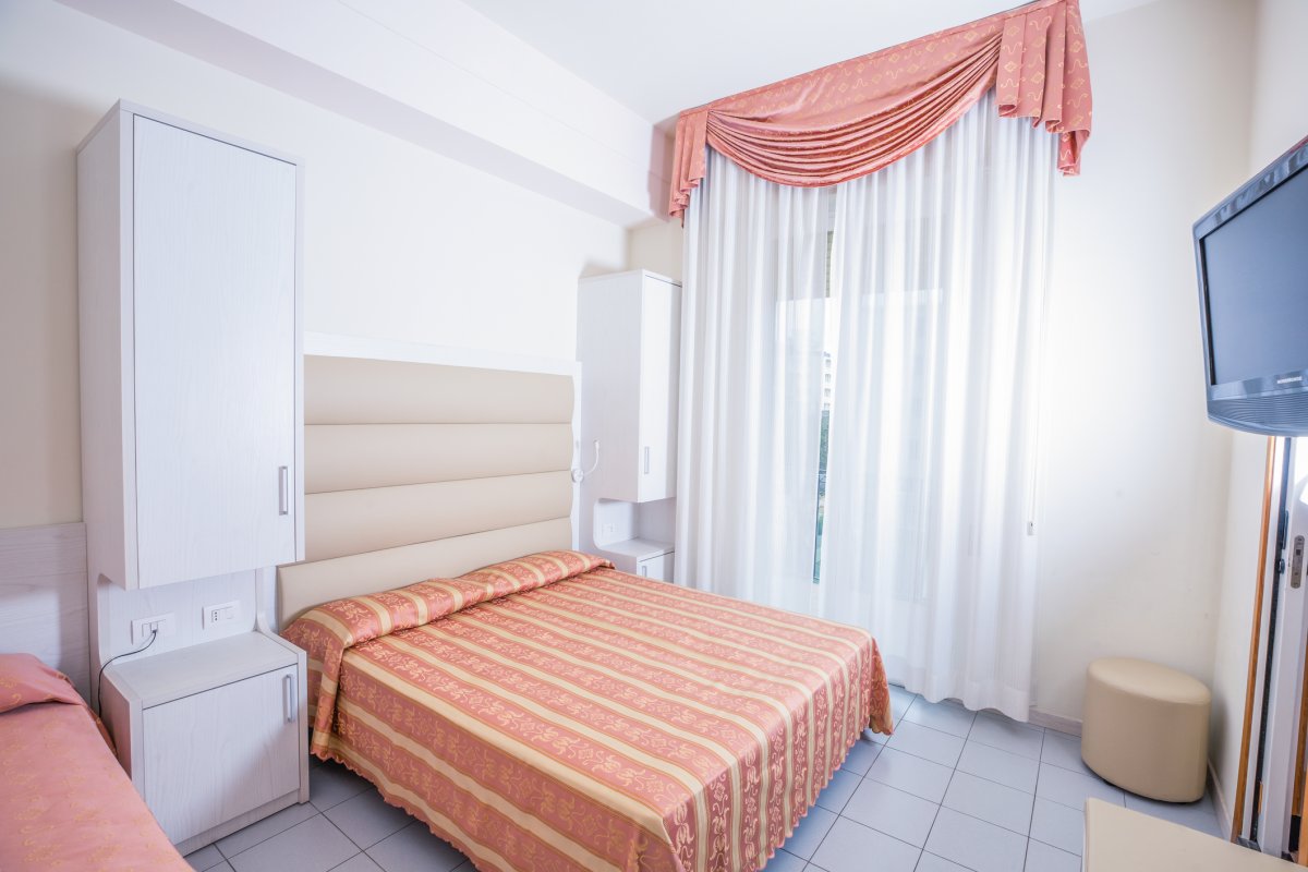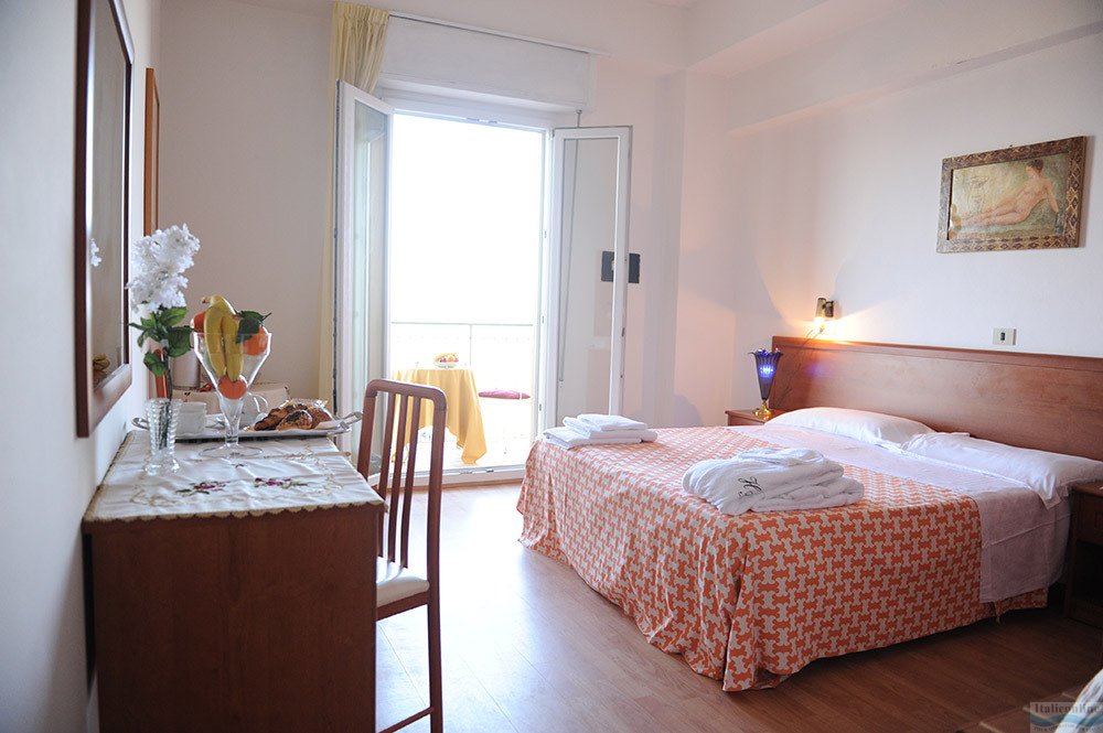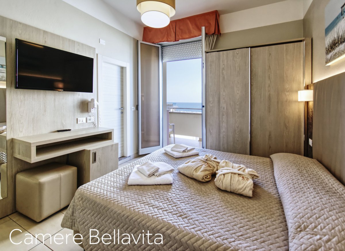 Zimmer: „Classic“ im Nebengebäude mit Dusche/WC, Safe, Föhn, Telefon, Sat.-TV, Klimaanlage, Balkon, WLAN. Gegen Aufpreis Zimmer „Superior Bellavita“ im Haupthaus zur Meer- oder Poolseite (2.-6. Stock) inkl. Kühlschrank mit täglicher Wasserversorgung.