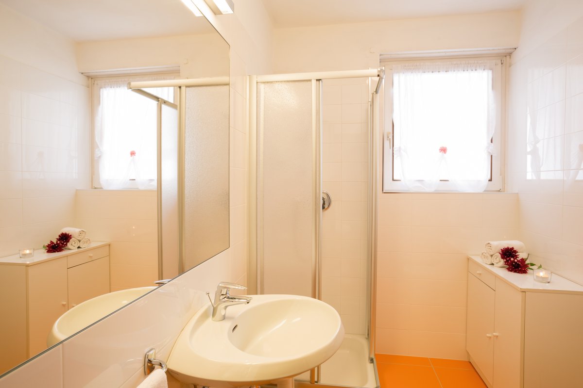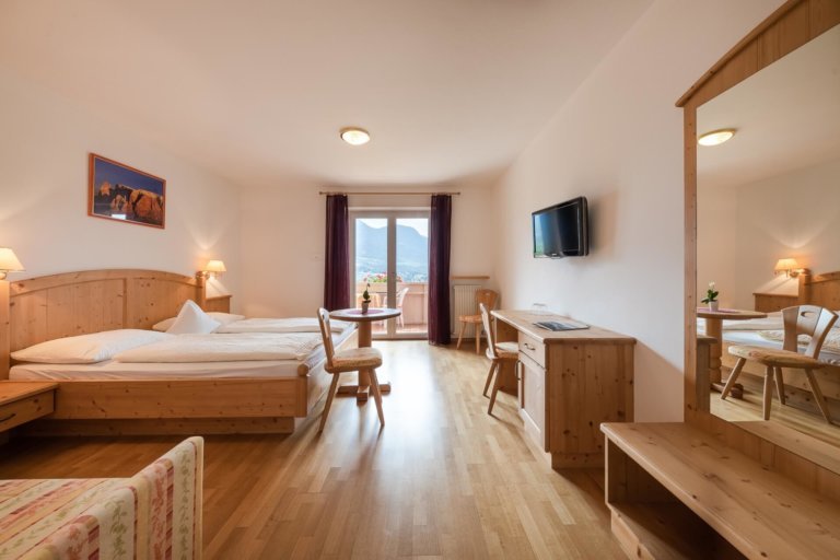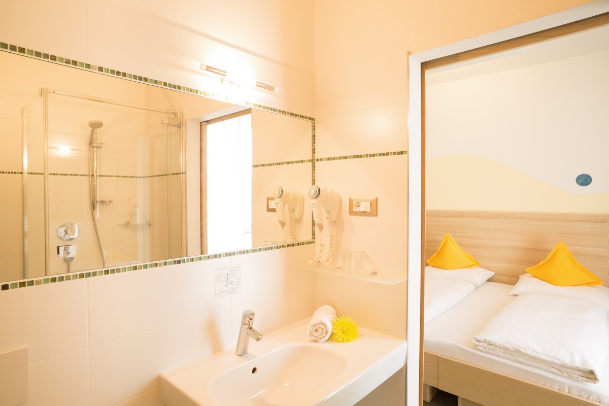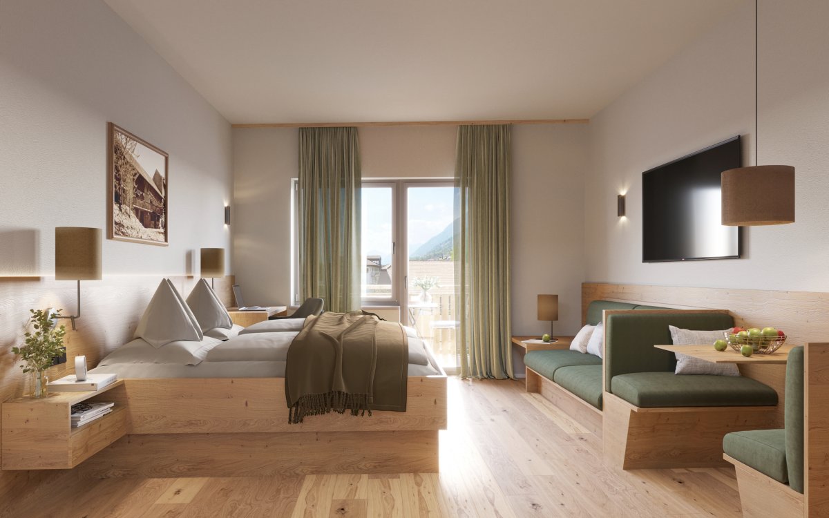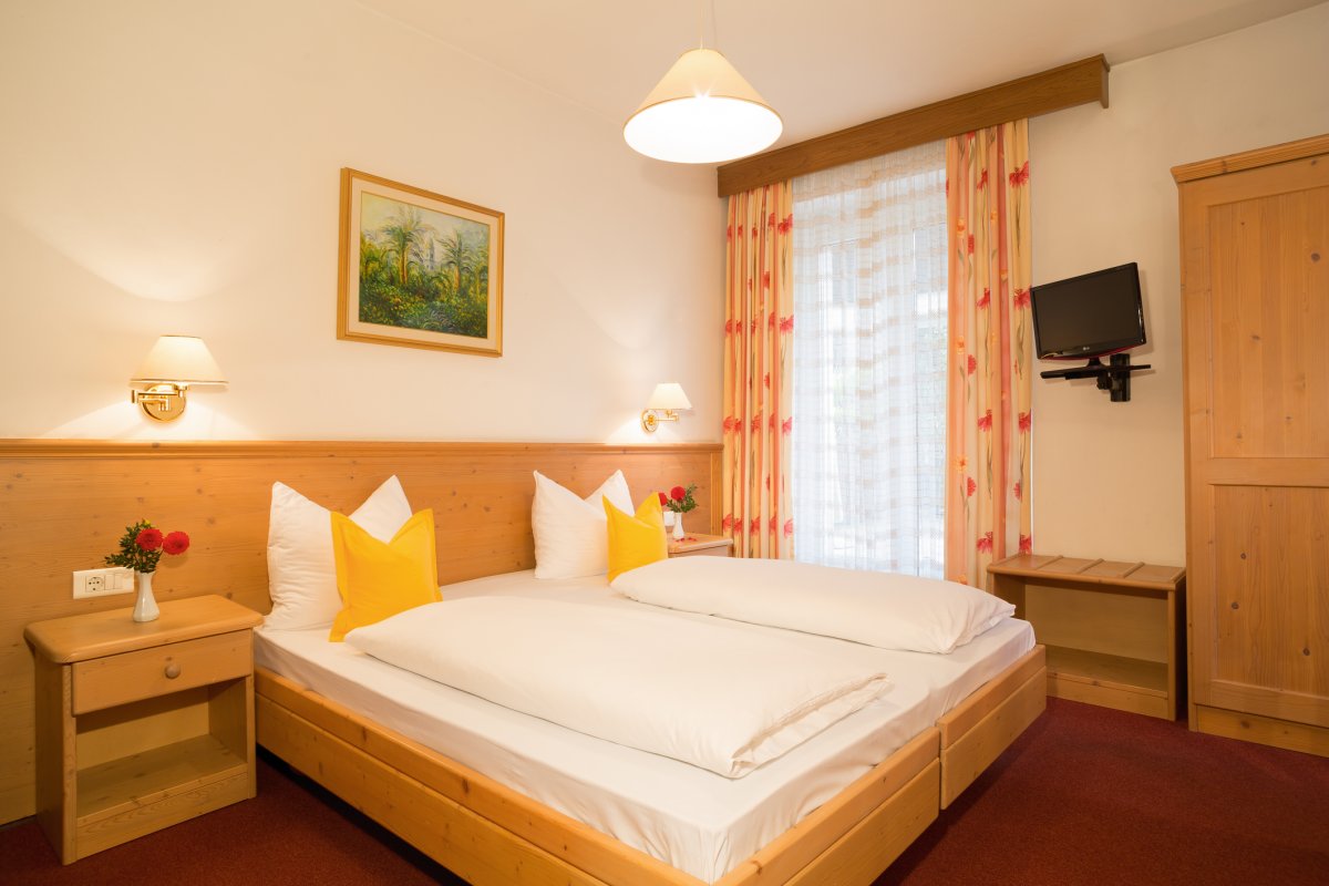 Zimmer: Renovierte Zimmer mit Dusche/WC, Balkon, Sat.-TV mit 42‘‘ Bildschirm und WLAN. Modernes Bad mit Glastrennwänden. Betten und Teile der Einrichtung aus Zirbenholz, Fußboden aus Lärchenholz.