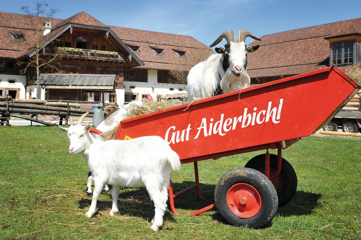 Das Gut Aiderbichl in Henndorf liegt ca. 20 km östlich von Salzburg, inmitten einer unberührten Landschaft und bietet nach einer beispiellosen Erfolgsgeschichte, zusammen mit seinen Außenhöfen, mittlerweile Platz für ca. 1.500 Tiere. Das Gut besteht aus einem Hauptstall, in dem hauptsächlich Pferde und Ziegen sowie das Showpferd Noah u.v.a. untergebracht sind. Über das ganze Gut verteilt finden sich weiterhin mehrere kleinere Gehege und Häuschen, in denen Hasen, Gänse, Hühner und Enten leben. Eine große Herausforderung war es auch, den Füchsen ein artgerechtes Leben einzurichten und mit dem eigens dafür errichteten Fuchsgehege ist dies bestens gelungen. Darüber hinaus gibt es ein Wildgehege sowie weitere Stallungen mit Rindern, Ziegen, Schafen, Ponys und Eseln, die jetzt ihr sorgenfreies Leben auf Gut Aiderbichl genießen können!