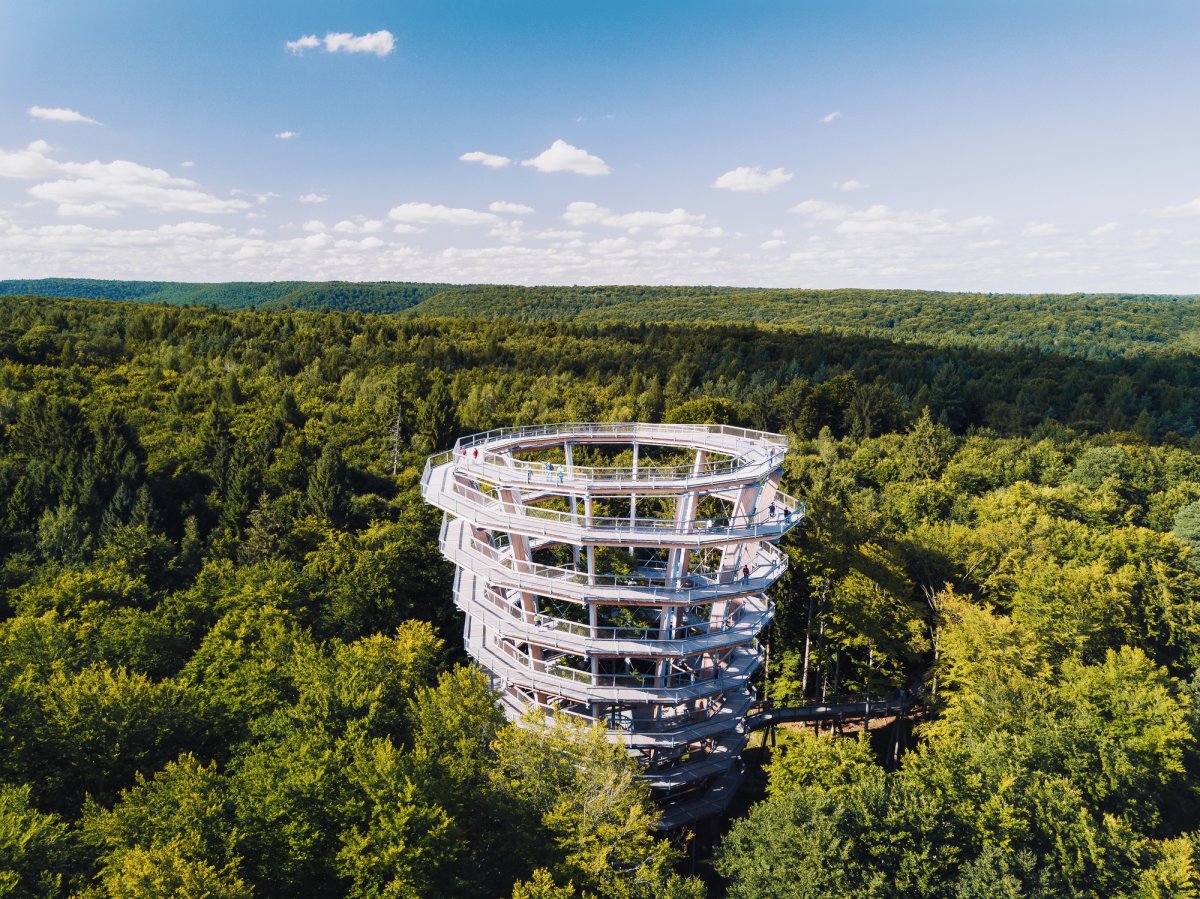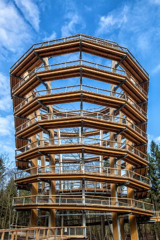 Mit dem Baumwipfelpfad geht es hoch hinaus! Der über 1 km lange Weg (genau 1.150 m) beginnt auf dem Waldboden und führt bis zu den Baumwipfeln in 26 m Höhe hinauf - der Zugang ist barrierefrei. Man flaniert zwischen Baumkronen und genießt dazu einen Blick über die sanften Hügel des Steigerwaldes ...