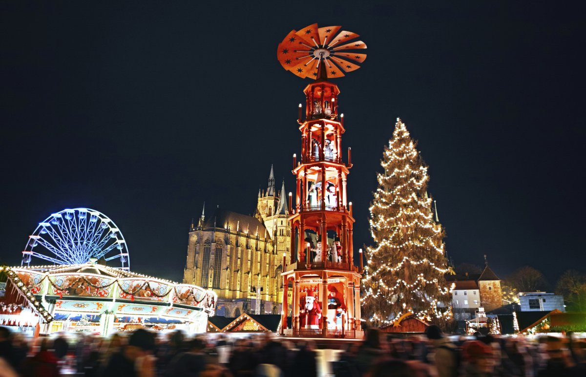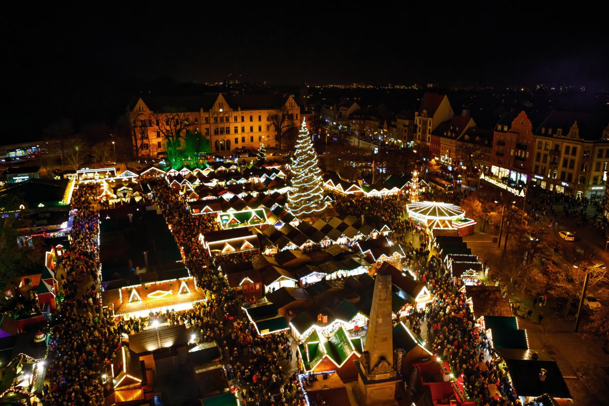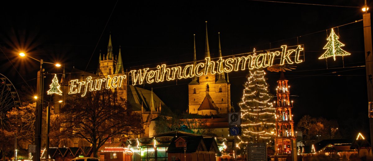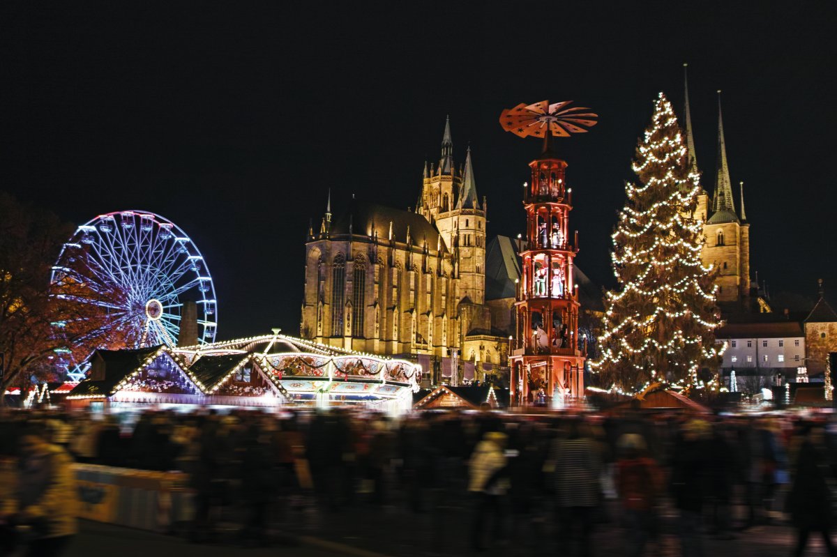 Weihnachtsmelodien erklingen und der Duft von Glühwein und Pfefferkuchen liegt in der Luft. Diese einzigartige Altstadt ist die ideale Kulisse für eine stimmungsvolle Vorweihnachtszeit mit einem besonderen Weihnachtsmarkt. Der Erfurter Weihnachtsmarkt gehört zu den schönsten Weihnachtsmärkten Deutschlands und ist der größte in Thüringen. Die mittelalterliche Altstadt Erfurts um den Domplatz bietet die ideale Kulisse für eine stimmungsvolle Vorweihnachtszeit. Traditionelles Handwerk und Thüringer Spezialitäten sind ebenso zu finden wie eine riesige, kerzengeschmückte Weihnachtstanne mit Krippenhaus und handgeschnitzte, fast lebensgroße Figuren sowie viele Geschäfte nach Schaustellerart. Die gesamte Innenstadt liegt im Lichterglanz, Geschäfte und Kaufhäuser haben Adventsschmuck angelegt. Weihnachtsmelodien erklingen, und der Duft von Glühwein und Pfefferkuchen liegt in der Luft. Bemerkenswert sind die ca. 25 Meter hohe, festlich beleuchtete Weihnachtstanne, die Krippe mit 14 handgeschnitzten, fast lebensgroßen Holzfiguren und die 12 Meter hohe Weihnachtspyramide. Besonders an den Adventswochenenden wird ein reiches Veranstaltungsprogramm geboten.