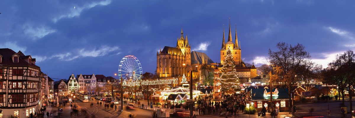 Erfurt lädt ein zum Rendezvous in der Mitte Deutschlands! Die Landeshauptstadt Thüringens schmückt sich festlich im Advent. Geprägt durch einen der am besten erhaltenen mittelalterlichen Stadtkerne Deutschlands ist die Stadt eine reizvolle Mischung aus reichen Patrizierhäusern und liebevoll rekonstruierten Fachwerkhäusern. Mariendom und Severikirche, dieses monumentale unverwechselbare Bauensemble und zugleich Wahrzeichen Erfurts ist in warmes Licht getaucht.