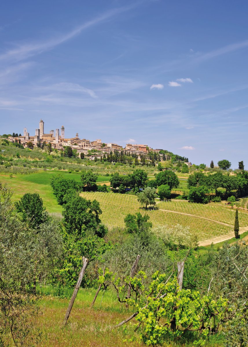 Fahrt ins schöne Flusstal der Elsa. Wanderung ab Colle Val d' Elsa zu einem Landgasthaus (Gehzeit ca. 2,5 Std.; ca. 200 HM). Fahrt mit dem Bus nach San Gimignano, wo Sie durch die Gassen des "ital. Rothenburgs" spazieren.