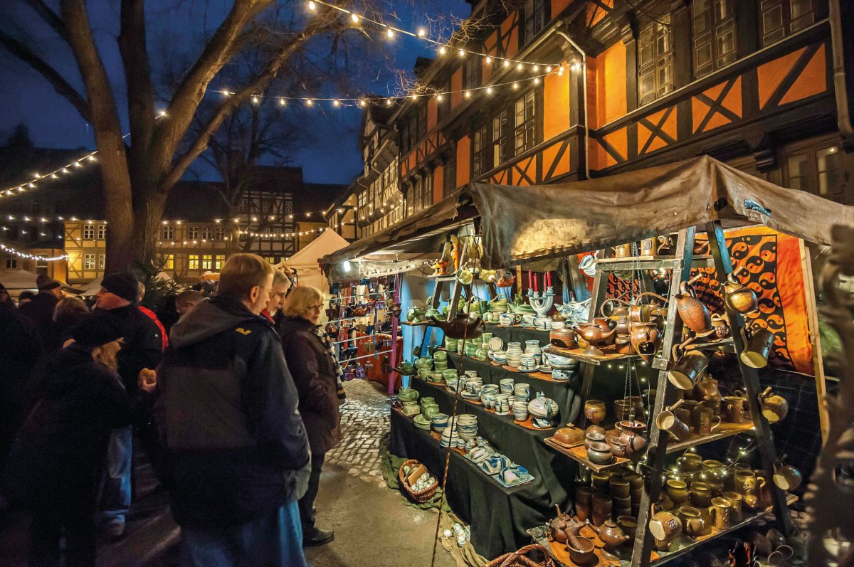Quedlinburg, die Perle im Harz, lädt ein zum „Advent in den Höfen“. Höfe, die übers Jahr verschlossen hinter dicken Mauern im Dornröschenschlaf liegen und nun festlich geschmückt mit kostbaren Waren, weihnachtliche Atmosphäre atmen. Verführerischer Duft von Punsch und Bratapfel, gebrannten Mandeln und gerösteten Maroni zieht durch die winkeligen Gassen.