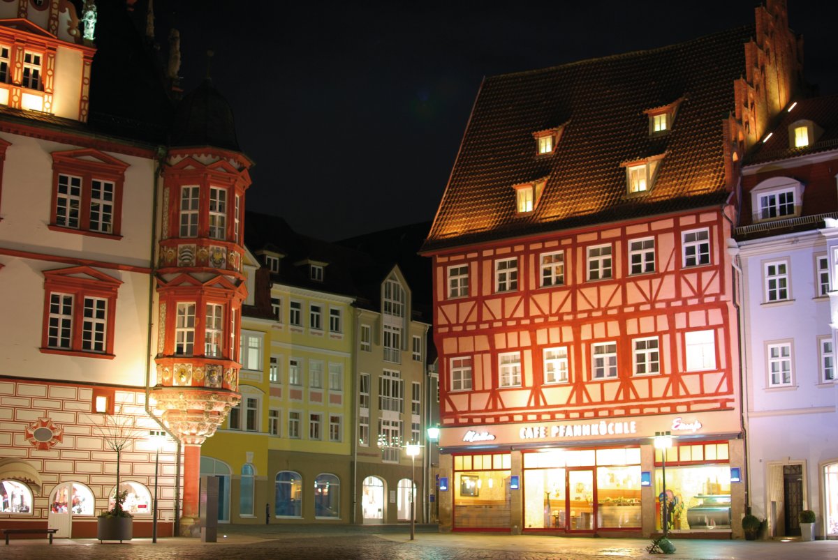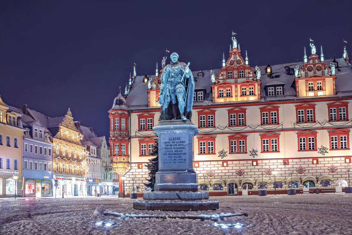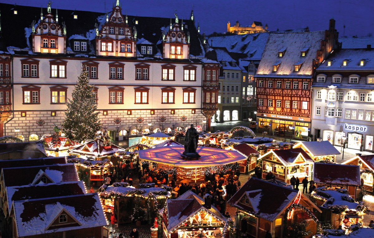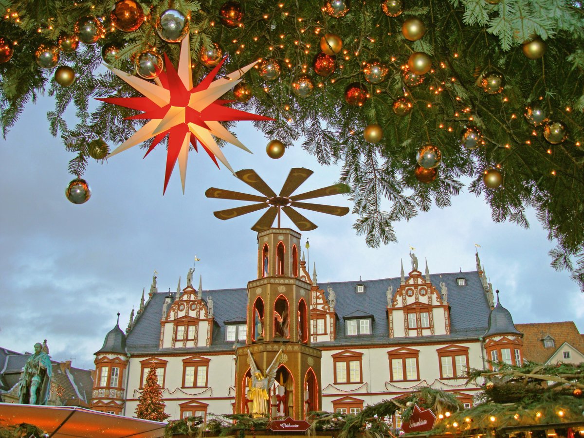 Der Weihnachtsmarkt in Coburg gehört zu den schönsten vorweihnachtlichen Märkten in Franken. Der Marktplatz - eingebettet zwischen dem historischen Rathaus und der alten Herzoglichen Kanzlei - verwandelt sich in der Adventszeit in eine richtige kleine Weihnachtstadt, die ihre vier Tore pünktlich um 17.00 Uhr am 1. Advent für Besucher öffnet. In "lebenden Werkstädten" zeigen Kunsthandwerker aus der Region ihr Können, an den zahlreichen Buden wird Glühwein, Punsch, Süßes und Pikantes gereicht und ein altes Karussell unterhält nicht nur die kleinen Besucher, sondern sorgt auch für nostalgisches Flair. Zu Recht wird der Markt in Coburg auch als "Weihnachtsmarkt für Romantiker" bezeichnet.