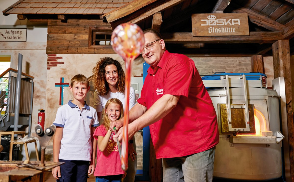 Im "JOSKA Glasparadies" in Bodenmais, mit fast einer Million Besuchern die meistbesuchte Glashütte der Glasstraße, kann man auch bei der Entstehung der Gläser und Pokale in der Glashütte zusehen. Auf einer Fläche von mehr als 70.000 Quadratmetern wird im JOSKA Glasparadies Glas in Vollendung präsentiert und das von vielfältigen Geschenkideen, edlen Kristalllüstern bis hin zum hochwertigen Künstlerunikat. Und wer Lust hat, der kann sich hier eine eigene Glaskugel blasen und mit nach Hause nehmen.