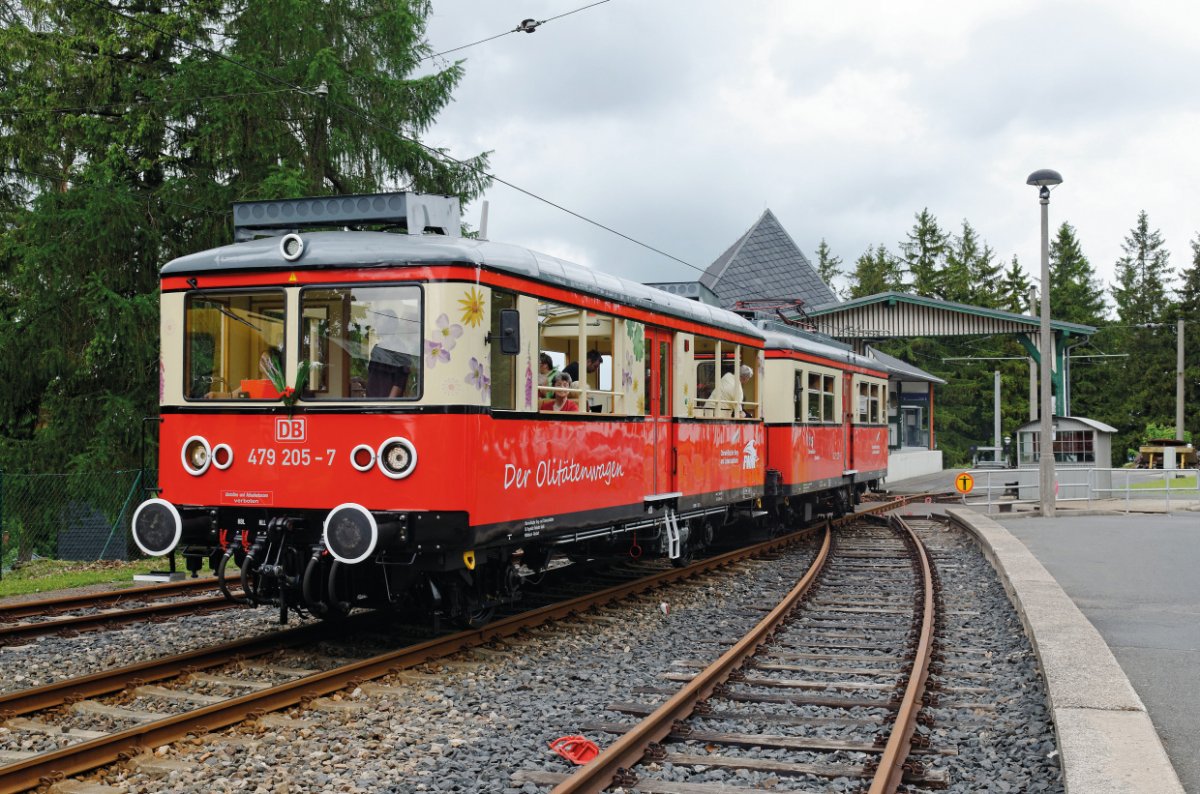 Auf der historischen Flachstrecke von der Bergstation Lichtenhain über Oberweißbach nach Cursdorf fahren zwei historische Elektrotriebwagen (Baureihe ET 479). Diese Triebwagen sehen Sie nur bei uns, sie sind echte Unikate, da sie speziell für die Bergbahn in den 1960-er und 1970-er Jahren gebaut bzw. umgebaut wurden. Auf der 2,5 km langen Panoramastrecke kan man seinen Blick über die Weite des Thüringer Waldes schweifen lassen!
