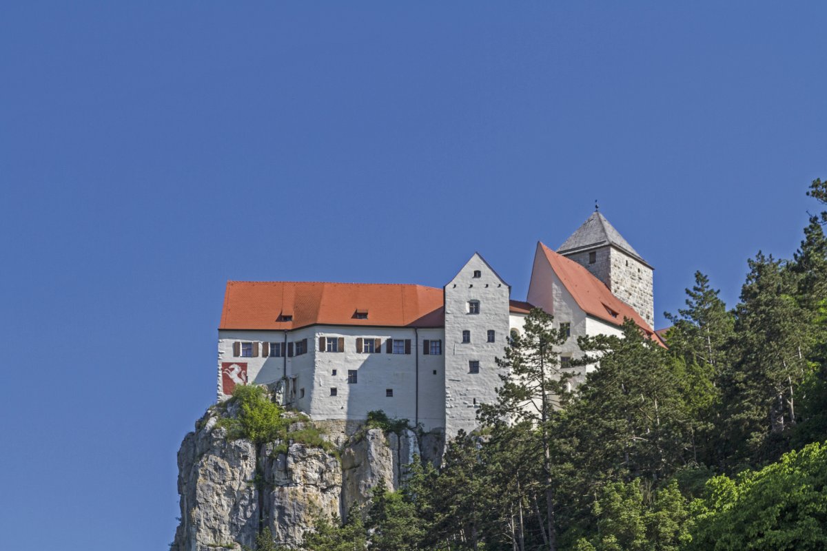 Wie das Idealbild einer Ritterburg steht die Burg Prunn auf einem nahezu senkrecht emporragenden Jurafelsen hoch über dem Flusstal der Altmühl. So beeindruckend die Burg von der Ferne aussieht, so begeisternd sind die Blicke von dort auf die umgebende Landschaft des Altmühltals. Die Herren von Prunn werden erstmals 1037 erwähnt; sie wählten den Ort gewiss auch wegen der günstigen Lage an mehreren Verkehrswegen aus. Die Burg selbst stammt aus der Zeit um 1200, der Blütezeit des Burgenbaus. Damals kam dem Donauraum um Kelheim unter dem bayerischen Herzog Ludwig I. große Bedeutung zu. Zu den ältesten Bauteilen gehört der 31 Meter hohe Bergfried. 1288 erwarb Herzog Ludwig von Bayern die Burg von den Herren von Prunn-Laaber. In der ersten Hälfte des 14. Jahrhunderts belehnte der Herzog dann das Geschlecht der Fraunberger vom Haag mit der Burg. Ihr Wappen, der Schimmel auf rotem Grund, ziert noch heute weithin sichtbar die Burg.