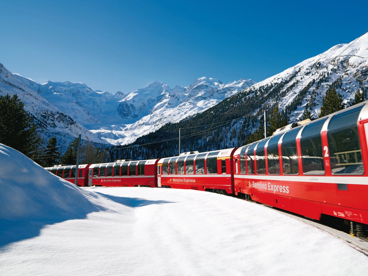 Das UNESCO Welterbe RhB und unberührte Alpenlandschaften zum Greifen nah: Eine Fahrt mit dem Bernina Express ist ein Reiseerlebnis der Extraklasse. Auf den höchsten Bahngleisen Europas und den steilsten der Welt nimmt der Bernina Express seine Gäste mit auf eine einmalige Reise durch 55 Tunnels und über 196 Brücken. Keine Bahnstrecke durchquert die Alpen auf so spektakuläre Weise. Die modernen Panoramawagen bieten erstklassigen Reisekomfort und lassen die eindrucksvollen Landschaften zum Greifen nah erscheinen.