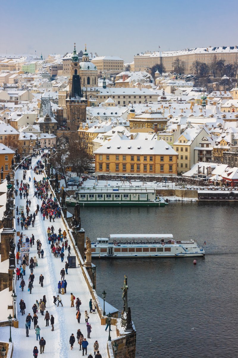 Das Einzige, was noch schöner ist als Prag im Dezember, ist Prag bei Nacht im Dezember, wenn die Stadt von der Weihnachtsbeleuchtung in ein warmes, bernsteinfarbenes Licht getaucht wird. Unternehmen Sie einen Spaziergang vom Prager Tanzenden Haus hinunter zur Karlsbrücke, um die atemberaubende Aussicht zu genießen.