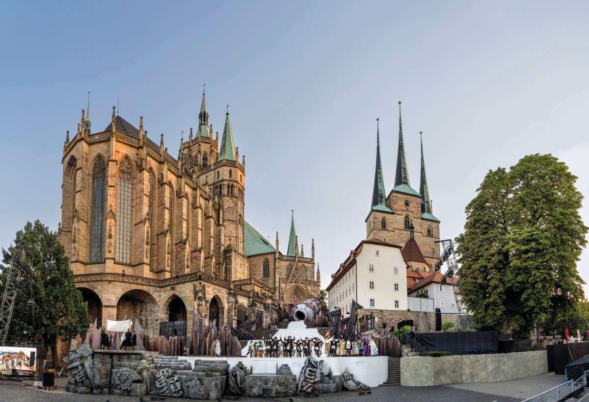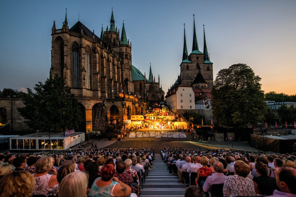 Seit über 25 Jahren bringt das Theater Erfurt jährlich ein neues Stück auf den Domplatz und verwandelt die 70 Stufen des Domberges vor der atemberaubenden Kulisse der St. Severin-Kirche und dem Mariendom in eine spektakuläre Open Air-Festspielbühne.