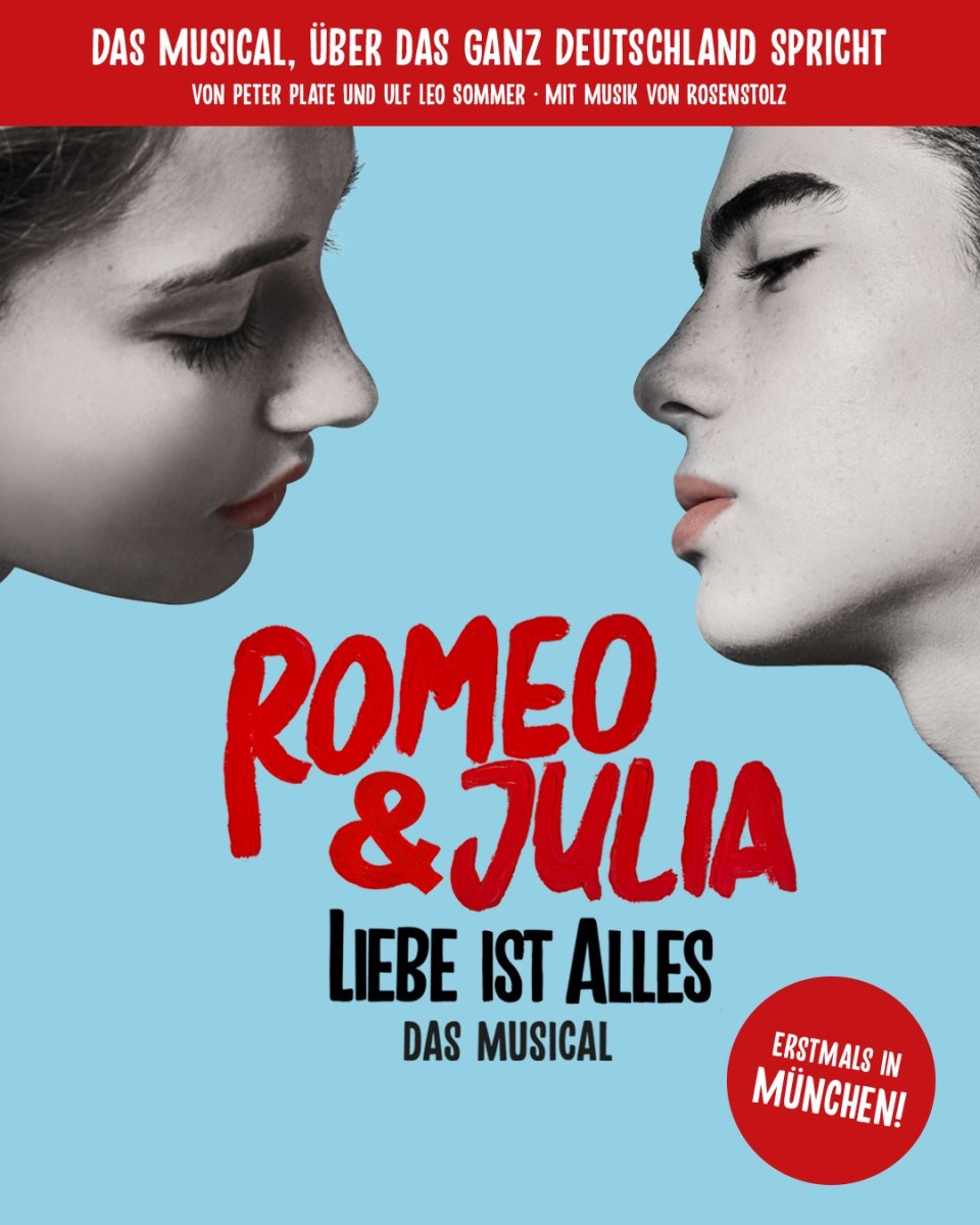 Nie war Julia so wild, nie war Romeo so sexy, nie war Mercutio so verliebt. Nach einer erfolgreichen Spielzeit in Berlin mit über 400.000 Zuschauerinnen und Zuschauern kommt das gefeierte Musical von Peter Plate und Ulf Leo Sommer Romeo & Julia – Liebe ist alles erstmals nach München. Verbotene Leidenschaft, atemberaubende Musik und eine Liebe, die stärker ist als Hass, Herkunft und Konvention.